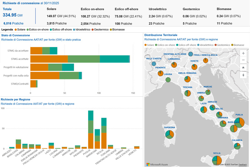At 31st October 2025, the renewable connection requests in Sardinia accounts for almost 48 GW (almost 700 active applications), 38% from photovoltaic, 30% from wind on-shore, 31% from wind off-shore. Almost 80% of these requests are in the 2nd of the macro phases with the STMG accepted by the applicants.