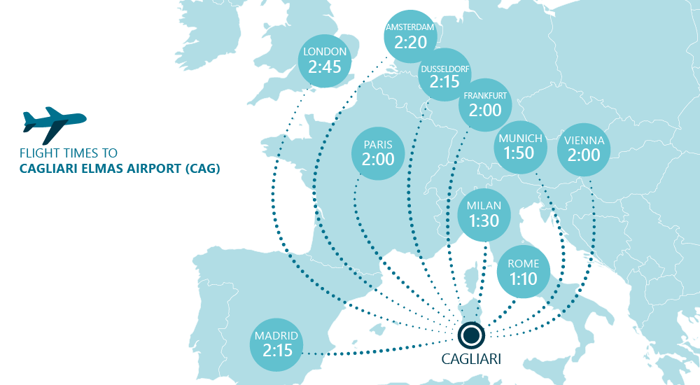 Situated in the western Mediterranean, Sardinia is about two hours by plane from mainland Italy and a short flight from other major European cities. The main airport of Sardinia is Cagliari Elmas Airport (CAG) in the south, with additional airports in Olbia and Alghero.